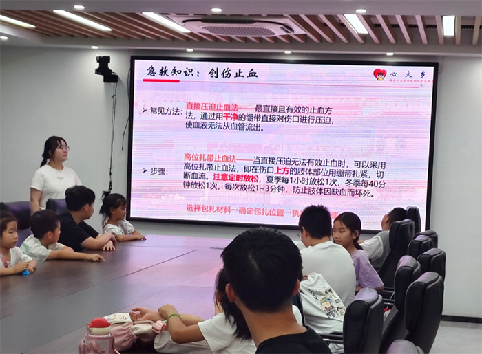 在急救演示環節,志愿者邀請兩名小學生上臺,用玩偶演示海姆立克急救法。“雙手這樣抱住肚子,向上用力——對,就像擠氣球一樣!”志愿者手把手調整孩子們的手勢,臺下的小朋友們也跟著比劃。當講到溺水急救的人工呼吸步驟時,志愿者特意放慢語速:“吹氣量要像給小氣球打氣,太用力會把肺吹破哦。”