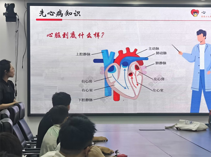 活動以“走近先心病”為主題,志愿者們先通過一組趣味問答熱身。“心臟在胸部左下方的請舉手!”幾乎所有孩子都高高舉起手,當聽到志愿者說“答對啦”,人群里響起小聲的歡呼。隨后,志愿者結合圖片講解先心病的成因,提到“媽媽懷孕時感冒可能影響寶寶心臟”時,坐在前排的小女孩輕輕拽了拽志愿者的衣角:“那我要提醒媽媽生病時不亂吃藥。”