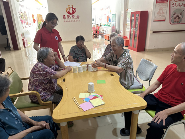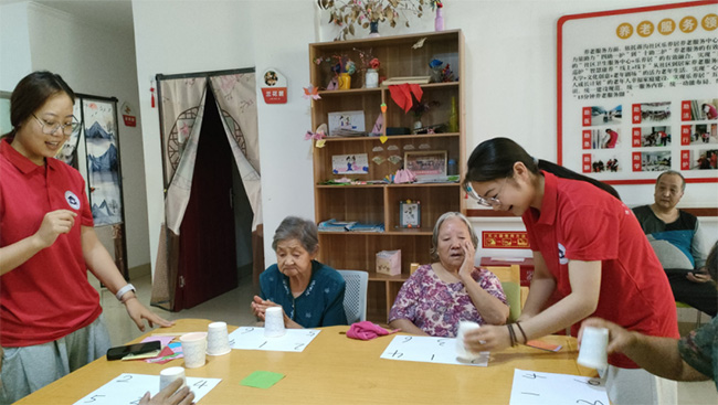 最富有創意的是紙杯乒乓球游戲,這是一個簡單但極具挑戰性的活動。使用紙杯搭在一塊,吹動乒乓球讓其掉落在紙杯中。該游戲旨在讓老人們在輕松愉快的氛圍中體驗運動的樂趣,同時也活躍了他們的身體機能。