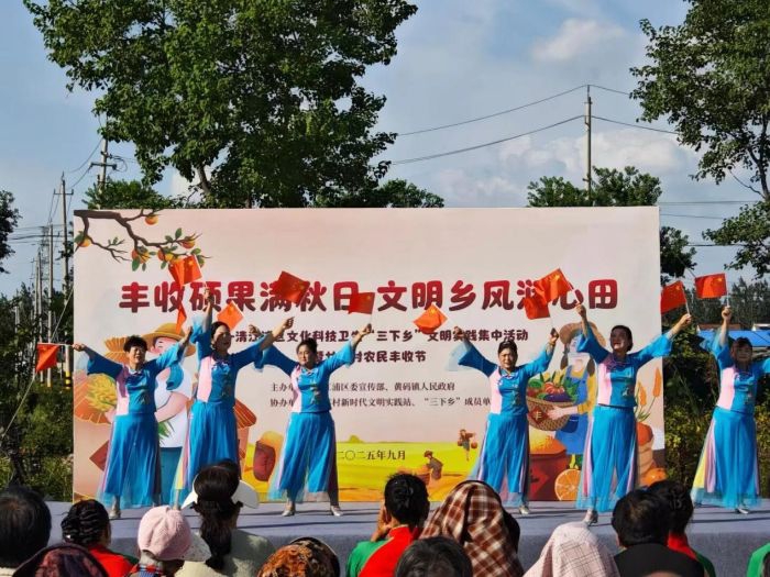 節目開始前,清江浦區黃碼鎮人民政府宣傳統戰委員張昕琦發表了致辭,拉開了此次音樂節活動的序幕。緊接著音樂節在華飛藝術團恢宏熱烈的舞蹈《五星紅旗》中啟幕。演員們以飽滿的情緒和鏗鏘的舞步,演繹出對家國的深厚情感,也舞出了農民歡慶豐年的自豪。隨之而來的“夾花生大賽”“袋鼠跳一跳”等農趣游戲,巧妙將農耕勞動轉化為趣味互動,使觀眾在參與中重溫勞動之美,感受豐收之樂。