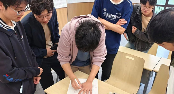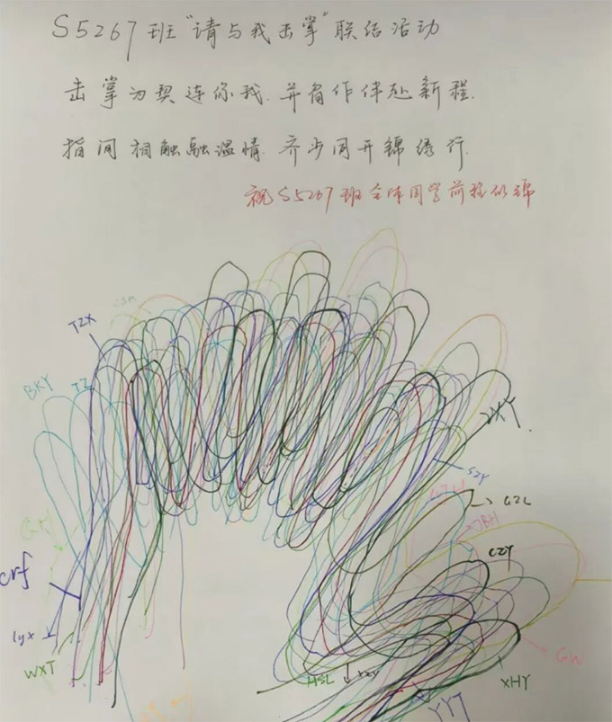 隨著活動推進,教室里的創作熱情愈發濃厚。有的同學專注勾勒掌紋,有的認真挑選彩筆,各有各的投入模樣。在這個過程中,同學們不僅釋放了科研與生活中的壓力,更通過這張承載著所有同學手輪廓的紙,感受到了與全班同學緊密相連的溫暖,心靈在互動與創作中得以舒展愉悅。