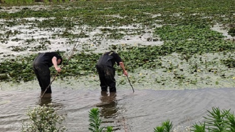 徐先生帶領同學們參觀了養殖中心一百二十余畝的睡蓮、荷花與茭白,看著長勢喜人的作物,徐先生眼中滿是喜悅與希望。在了解了養殖基地的基本情況后,同學們穿上防水褲,親身體驗了烈日下的睡蓮幼苗采摘工作,對鄉村企業工人的艱苦有了具象化的認識。