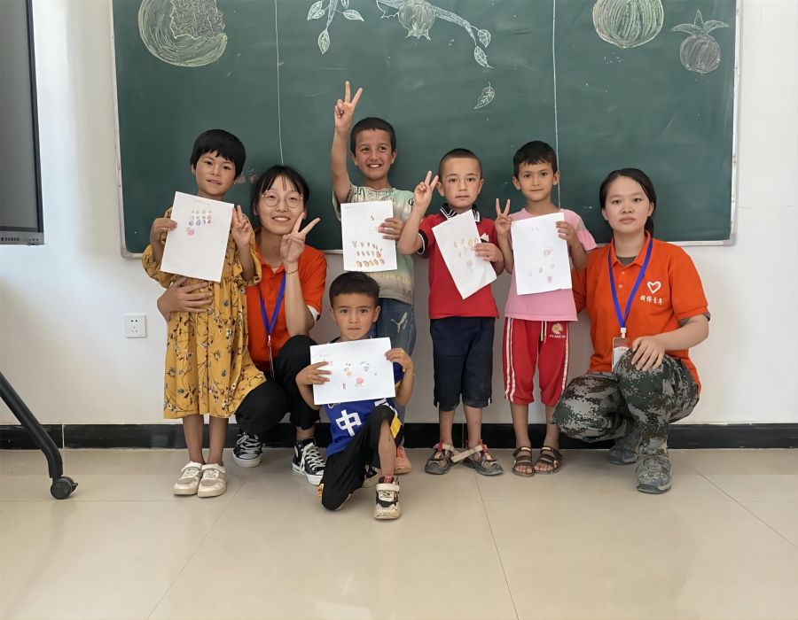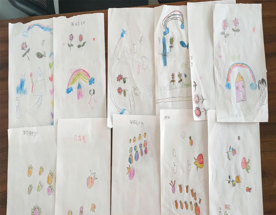 圖為繪畫完成后團(tuán)隊(duì)成員與小朋友及繪畫作品的合影