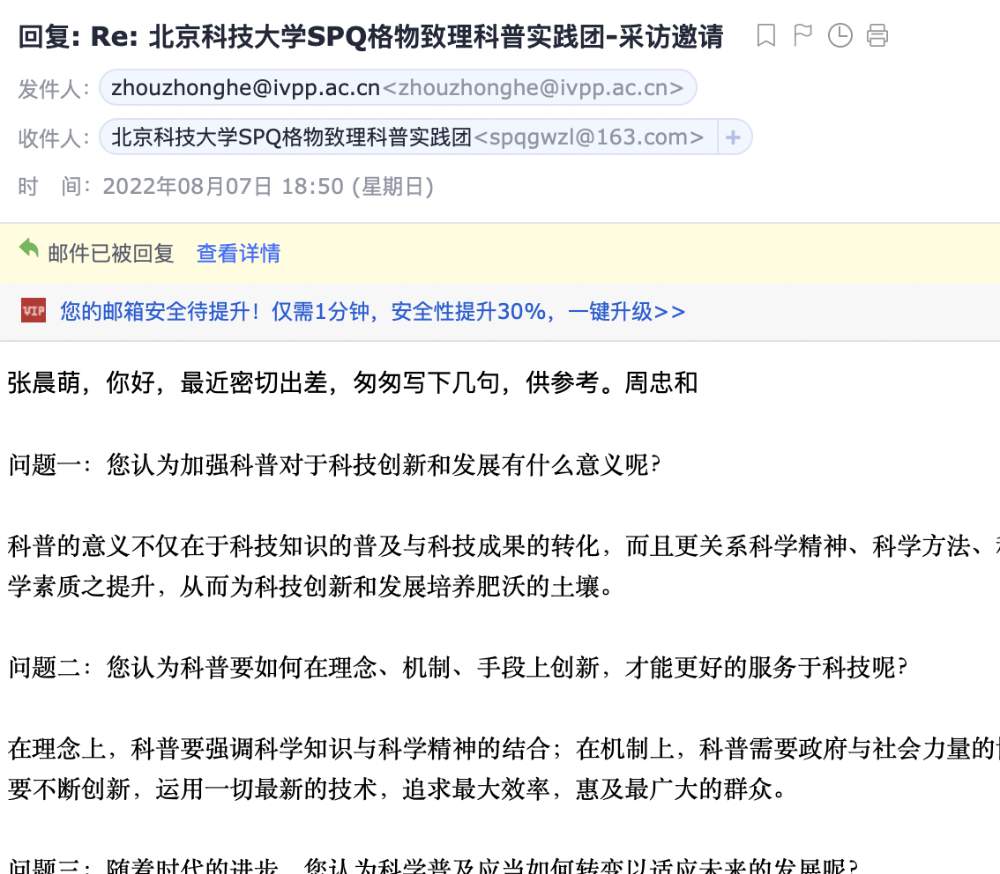 為深入了解群眾對科普的需求情況,團隊成員在線上發布科普需求情況調查問卷,成員們通過“您通過哪些渠道了解科學知識和科普教育”“您印象最深刻的科普教育活動”等16個簡單的小問題來了解當前科普教育現狀和公民對于科普教育的重視程度。同時,團隊成員聯系到中國科學院周忠和院士采訪,通過了解“您認為科普要如何在理念、機制、手段上創新,才能更好的服務于科技呢?”等問題,團隊及時調整科普方式,順應時代發展要求。