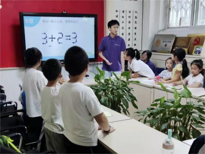 圖為實(shí)踐隊(duì)成員為小朋友們講解趣味數(shù)學(xué)課“如何移動(dòng)一根火柴使等式成立”。多彩大學(xué)生網(wǎng)通訊員 謝思成 攝