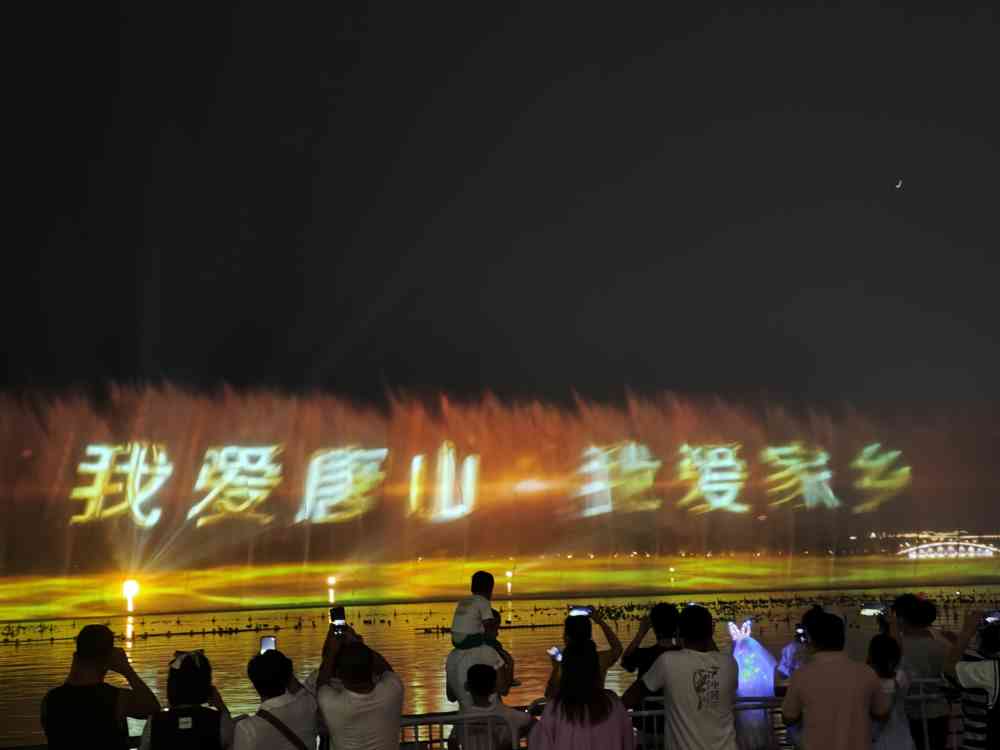 脆啼一聲,神鳥輕掠而過,水幕燈光秀正式開始。這無疑是一場視覺盛宴。光影交疊、美輪美奐,再現(xiàn)唐山這座工業(yè)城市的科技力量之盛;水柱輕移,如蓮瓣靜綻,如水袖翩躚,紅蓮青葉的元素頗具古韻,足顯文化底蘊與自信;隨著映有英雄的城市、英雄的人民、英雄的事跡的水幕徐徐展開,中心的水柱沖天而起,色彩變幻間,氣勢磅礴、充滿力量而直擊人心,仿若擎天之柱,