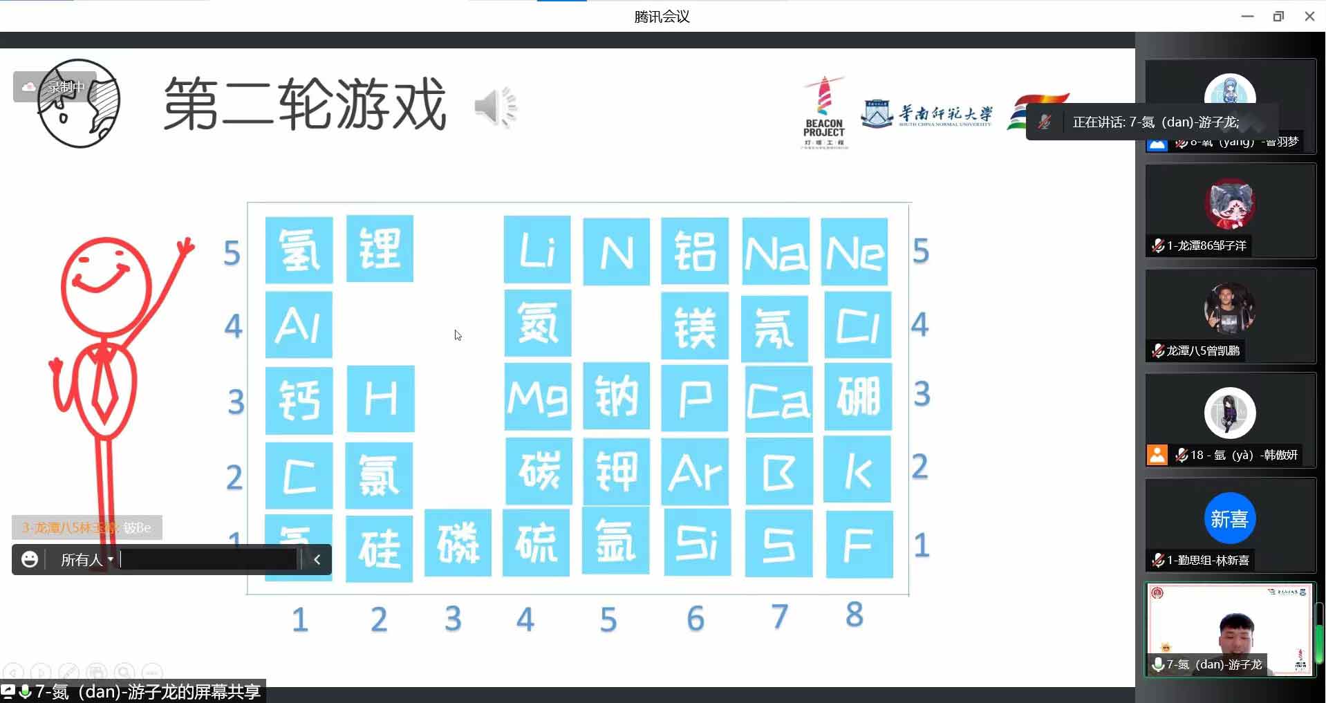 游戲化學,寓教于樂。將游戲與化學知識相結合,以創新游戲理念普及化學知識,是本次夏令營線上課程的亮點之一。游戲化學課程之一《元素連連看》的三位授課老師帶領同學們學習元素周期表,開啟化學世界的大門。授課老師用“故事記憶法”、“讀字讀半邊”、“聯想記憶法”的小技巧幫助同學們記憶化學元素的中文名稱讀法,而后進一步學習這些化學元素的性質與特征來加強記憶,最后通過簡單的連連看游戲,將元素中文名稱與符號一一對應消除,檢驗學習效果,讓同學們在歡聲笑語中掌握了化學知識。寓教于樂是教育活動的最高境界,以情施教、情知交融、以樂助學,可以使教育活動收到事半功倍的效果。