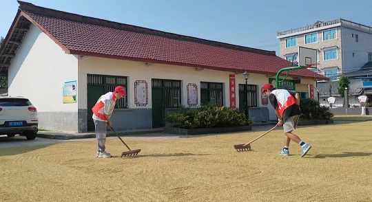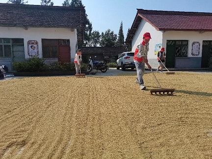 隨后,實踐團成員跟著村支書一起坐在剩余的一輛電動三輪車里返回稻谷晾曬廣場,在車上團長問到村里每年的糧食產量情況,根據村支書介紹,了解到村里的土地流轉初顯規模,糧食機械化種植生產也基本達標,今年水稻面積達500畝,預計可收入稻谷十萬斤,每年要賣米八萬斤,每戶村民增加收入近萬元。隨著車子的逐漸靠近,大家到達了打稻場,片刻不敢休息,立馬加入到清理空地的隊伍中,有拿掃帚的,有拿簸箕的,不一會就清掃出一大片空地,將車上的稻谷倒在地上,分出一個個小山堆,就開始了水稻脫粒工作。實踐團成員和村民一起,將一堆堆稻谷裝起來,倒到院子里的打谷機中,“噠噠噠”的打稻機聲經久不息,震耳欲聾,似乎在預示著今年又是一個豐收年。不一會兒,一筐筐金黃色的稻谷從打稻機后不斷地運出,村民們已經笑得合不攏嘴。在大家齊心協力的勞動下,整片空地鋪滿了稻子。趁著太陽高照,成員們一個個手拿耙子,來回穿梭在其中,不停地翻動著,讓稻子充分接受光照,進行晾干。
