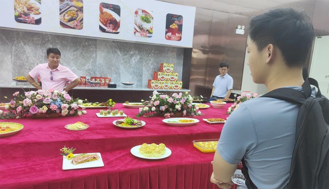 接著我們一行參觀了恒興集團的預制菜展覽,各種精美的預制菜模具讓人應接不暇,馮治國總監(jiān)介紹說,研發(fā)組每周都會研發(fā)一款預制菜,并將其做成模型展出,每年將從其中挑選再進行生產(chǎn),預制菜幫助廚房小白輕松在家就能享用星級手藝。然后,我們來到恒興預制菜研發(fā)標準化廚房進行參觀,研發(fā)人員正在進行試菜,他們是十年以上粵菜大廚出身,精湛的廚藝與食品工業(yè)結合,讓美味走進千萬家。作為食品專業(yè)學生,第一次進入企業(yè)研發(fā)廚房,我感到激動又好奇,親身體驗了食品研發(fā)人員的工作內(nèi)容與要掌握的經(jīng)驗技巧,讓我明白學習是永不止步的。