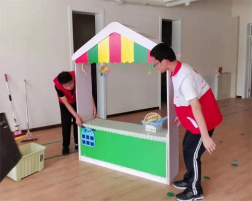 團隊成員自主幫忙整理玩具,幫忙清理小椅子,擦拭各種幼兒用品,推櫥子,整理區角……實踐隊員參觀了各個功能區,并用彩筆繪畫出對孩子們未來的期許和鼓勵。