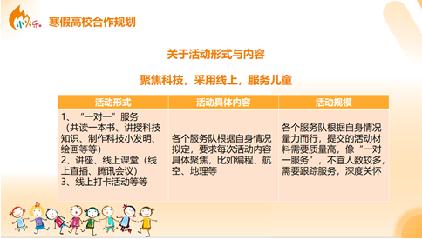 近日,活動啟動會議順利開展,各高校志愿服務隊取得共識并正式達成合作。陜西師范大學小火樂志愿服務隊與各協辦高校服務隊商議并制定了寒假合作規劃,共同確定了“線上科技講堂”、“科技小競賽”、“科技作品征集”、“一對一伴讀”等活動形式,并就活動開展的相關問題進行線上討論,并簽署了合作協議。