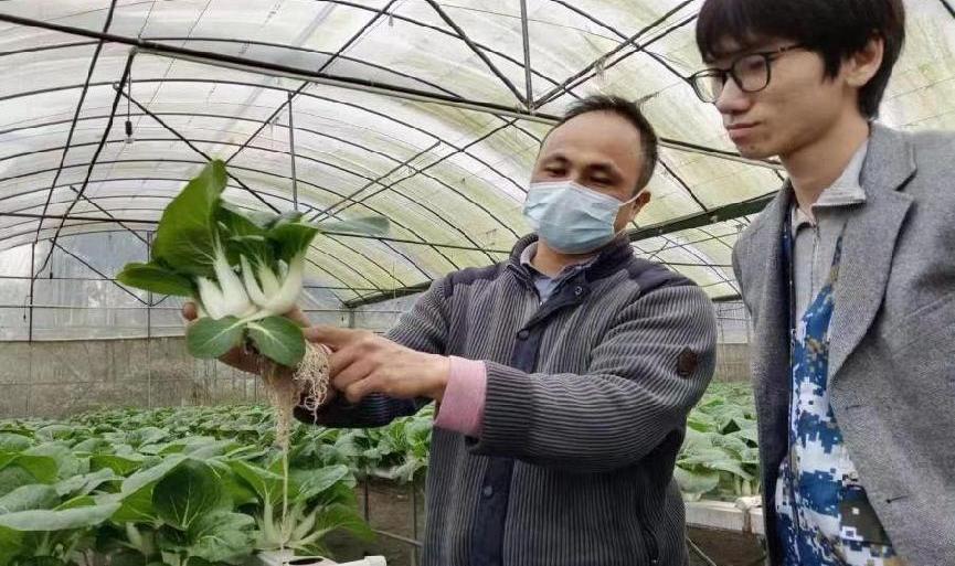 “軍創(chuàng)優(yōu)品”團隊成員與產(chǎn)品部經(jīng)理何金在溫室大棚蔬菜基地交流(來源:受訪者供圖)