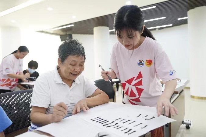 圖為書法小老師給奶奶講解 梁善茵 攝