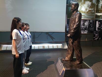 圖為實(shí)踐隊(duì)員向中國(guó)汽車工業(yè)奠基人饒斌同志致敬。通訊員 王珍宜 攝