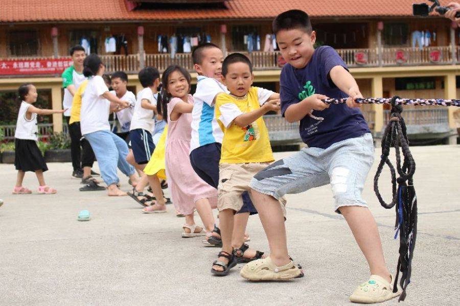 圖為志愿者和孩子們在拔河。秦金穗 供圖