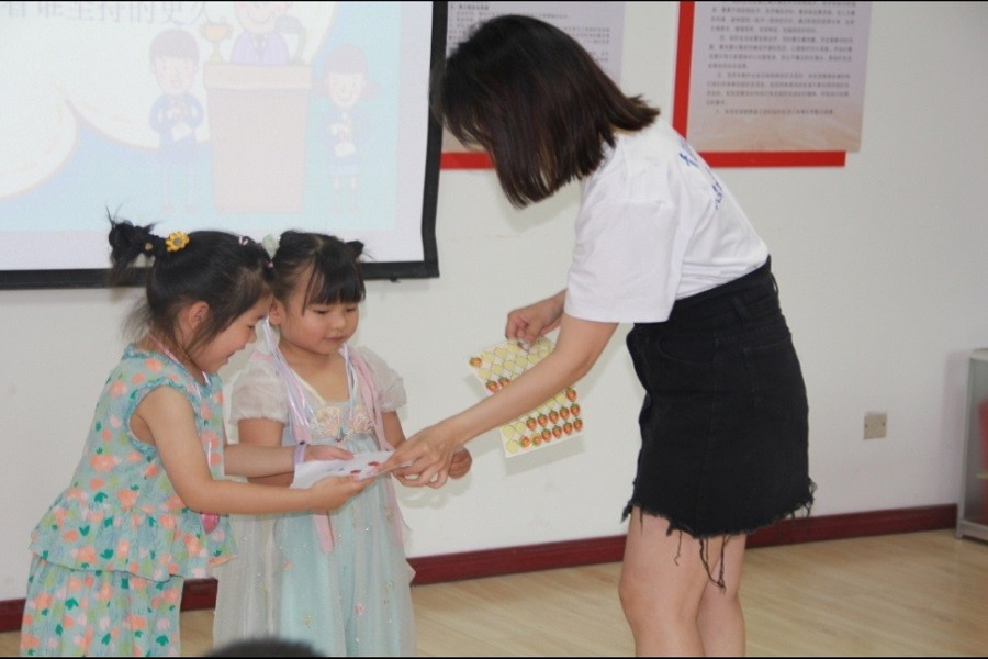 圖為主講老師用貼紙獎(jiǎng)勵(lì)積極表演的小朋友們。 通訊員 殷彤彤 供圖