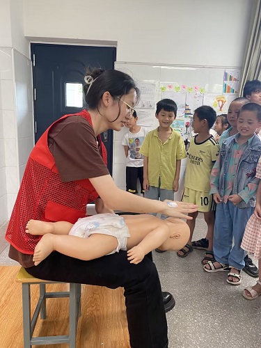 圖為社會(huì)實(shí)踐隊(duì)員想小朋友展示心肺復(fù)蘇術(shù)中的人工呼吸。多彩大學(xué)生網(wǎng) 通訊員 黃鉦雄 攝