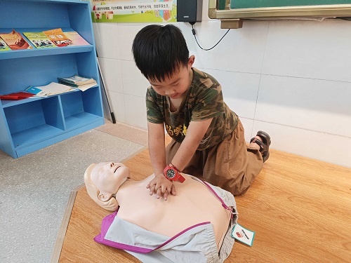 圖為小朋友練習(xí)心肺復(fù)蘇術(shù)。多彩大學(xué)生網(wǎng) 通訊員 黃鉦雄 攝