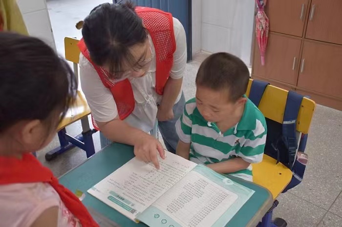 為社會實踐隊員對小朋友們進行作業輔導。多彩大學生網 通訊員 袁子航 攝