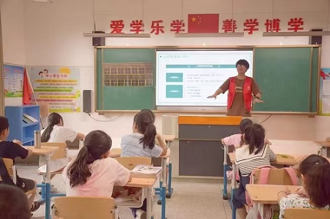 圖為社會實踐隊員向孩子們講解心肺復蘇理論知識。多彩大學生網 通訊員 袁子航 攝