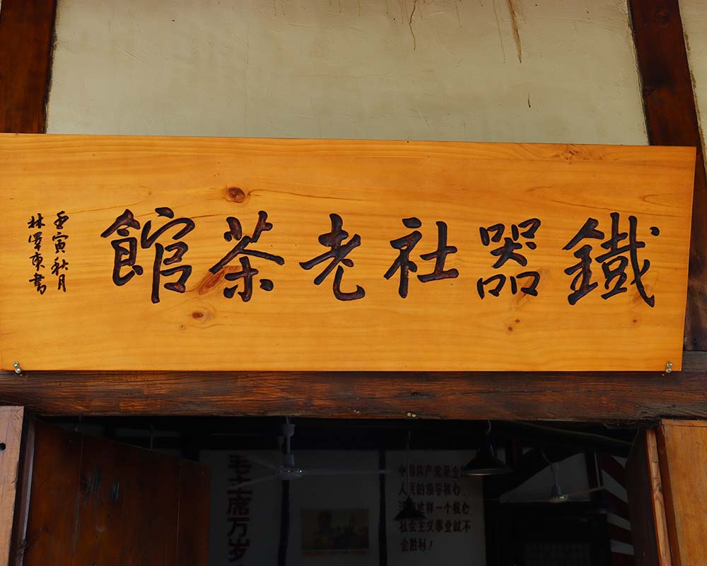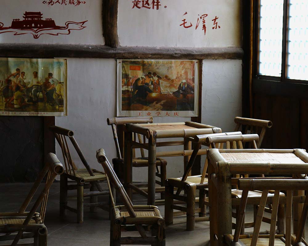 參觀完渭沱鄉(xiāng)情展示廳,“鄉(xiāng)得藝彰”國情觀察實(shí)踐團(tuán)成員們前往旁邊的老茶館。這里依舊保持著巴渝老建筑的模樣,一根根木梁用榫卯結(jié)構(gòu)佇立著,在滿墻都是毛澤東主席的語錄下,蓋碗茶的杯具正錯(cuò)落有致的擺放在架子上,館內(nèi)是渭沱鎮(zhèn)舊時(shí)代的遺存,館外看去渭沱鎮(zhèn)正在新時(shí)代的高速發(fā)展鄉(xiāng)村振興。自信的文化也需要與時(shí)俱進(jìn)的表達(dá),跨越時(shí)空界限,拓寬文化創(chuàng)新空間,展示鄉(xiāng)村文化的巨大魅力。