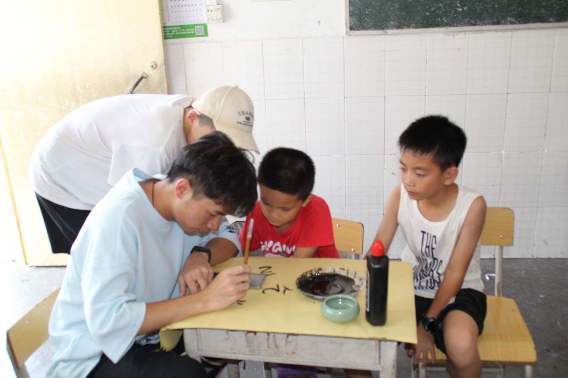 圖為志愿者給學生進行字形示范