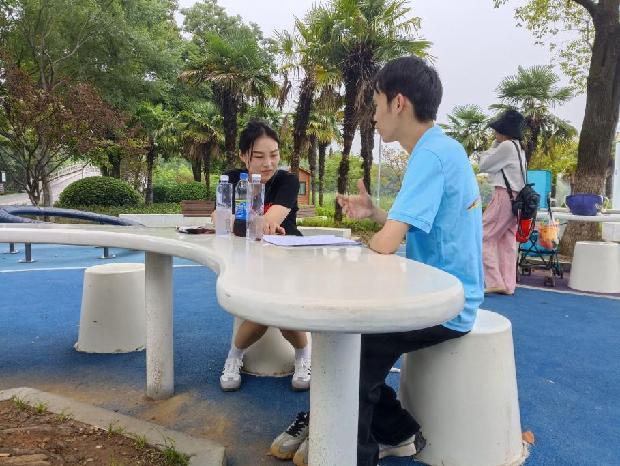 實(shí)踐團(tuán)成員在梁川生態(tài)公園對(duì)游客訪談宣傳
