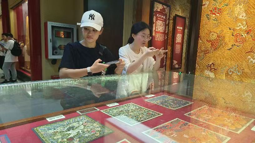 圖為金陵研學實踐團成員欣賞南京云錦博物館“明代武官補系列(復制品)”展柜