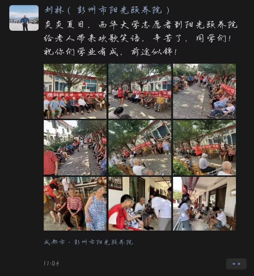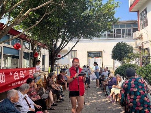為了宣傳敬老愛老意識,推進社會主義精神文明工作建設,在彭州市白馬社區王粲副書記的大力支持下,2023年7月9日,西華大學暑期三下鄉社會實踐活動隊伍“心穩致遠”隊來到彭州市白馬社區陽光頤養院,為老人們開展長征精神宣講、才藝展示、衛生清理以及身心健康關懷等活動,躬身社區養老治理服務,助力時代鄉村振興建設。