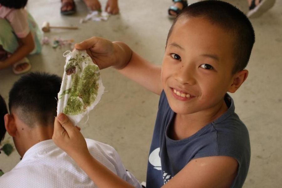 在志愿者老師的指導下,孩子們將植物設計成自己喜歡的圖案,用透明膠帶固定后,揮動錘子不斷進行敲打,隨著錘子的上下舞動,植物的汁液逐漸滲入織物之中,伴隨著孩子們歡快的笑聲,植物的自然色彩、脈絡紋理被永遠地印存在了布中。