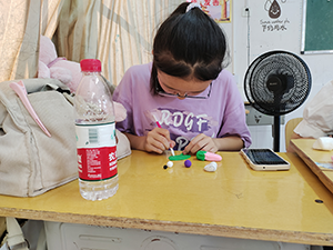 在炎熱的夏天,在一間沒有空調(diào)教室里,同學(xué)們無懼高溫,積極參加趣味活動(dòng)。好的戰(zhàn)士總是善于運(yùn)用身邊所擁有的工具,超輕粘土活動(dòng)參與者亦是如此。他們先捏出頭的形狀,接著利用刻刀,刻出眼睛、鼻子和嘴巴,一個(gè)頭就這樣完成啦。接著,繼續(xù)捏出身體和四肢,進(jìn)行組裝,進(jìn)行微調(diào),一個(gè)優(yōu)秀的作品也就這么完成了。如果覺得聽起來很簡單,那就大錯(cuò)特錯(cuò)了,這里就是典型的說起來容易做起來難。