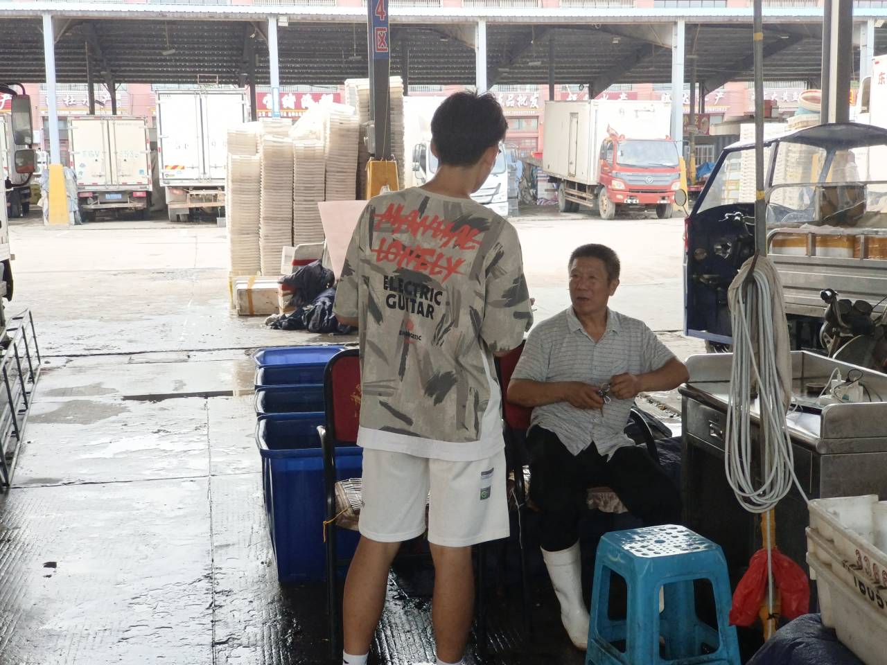 調研團隊來到蘇魯海產品綜合批發市場,首先感受到的是撲鼻而來的魚腥味,接著看到的是忙碌在自家儲貨車間前的商販們以及前來光顧的顧客們。工作車間里,商販們展現出了高超的工藝技能。他們忙碌地穿梭于貨架間,熟練地處理著各種海鮮。團隊成員意識到市場的快速運轉與海鮮工作車間的商販們的勤勞能干密不可分。