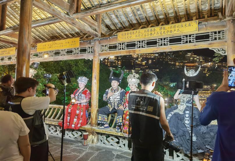 隨著互聯網自媒體行業的快速發展,近年來千戶苗寨最大的收入來源變為了苗服旅游旅拍。苗寨里大大小小共有100余家旅拍店,平均每十步路就能看見一家,且旅游旺季時全都門庭若市。游客多被網上圖片吸引而來,對苗族服飾有著濃厚的興趣。依托旅拍,雷山縣的苗繡與銀飾產業也被帶動起來,非遺文化產業也煥發新生機。為迎合當下潮流,苗族服飾也相應與時裝結合,并附上苗繡、苗銀等元素。當地旅拍店與非遺技藝合作社簽約,由于旅拍服飾對精美度要求低,合作社便可采用機器成批制作的方式,不僅減低成本,還能跟上需求。小型旅拍店里的苗族服飾與銀飾至少50套,大型的則有幾百套不止,平均每套旅拍價格在300至10000元之間。2021年,雷山縣政府開始將旅拍納入當地稅收項目,旅拍成為新形勢下帶動收入的新方式。