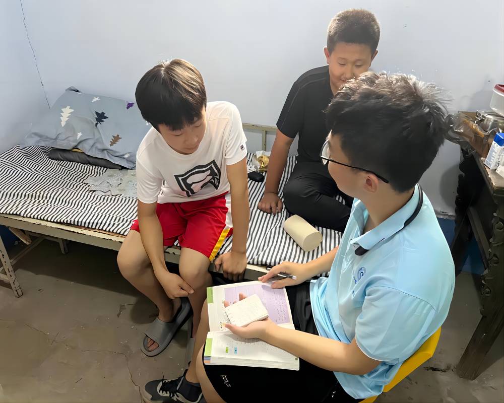 活動伊始,為滿足孩子們學科求知欲,解決學習過程中存在的各項問題,當地部分青少年頂著室外的陽光,攜帶自己的教材資料與筆記本,提前來到社會實踐團成員住宿區域,向實踐團成員主動請教有關學科知識。實踐小組成員鞭辟入里,借助本身對中學課業知識的一定理解,深入剖析有關學科知識點,以通俗易懂的方式對該學科存在的部分疑難知識點進行詳細解答。在進行課業輔導之中,孩子們有說有笑,現場氛圍輕松愉悅,在解決了一個又一個難題的同時,實踐團成員與孩子們的關系得到進一步提高。