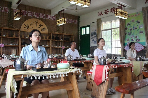 在吳世程老師的帶領下,實踐團成員先后參觀了紅領巾小茶園、六堡茶傳統工藝制作室和茶藝室,對六堡鎮中心校的“茶文化進校園”建設有了一定程度的了解。茶藝室內,吳老師以理論論述為輔,現場演示為主,開展了一場別開生面的茶文化教學。實踐團成員通過現場學茶藝、品茶香、論茶道,深刻領悟到推進茶文化與校園文化融合的重要意義。
