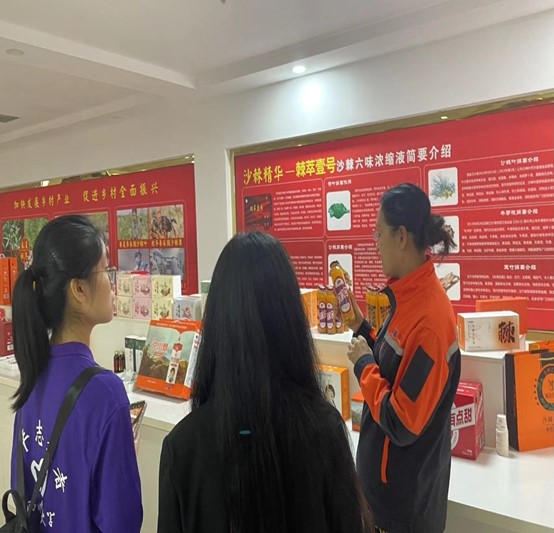 “這里是宋家溝村特色沙棘企業基地,這里記載了沙棘的生產、加工流程、功效、以及經濟價值,由我來給大家一一介紹,這樣也可以幫助大家對宋家溝村特色沙棘企業有更好的了解”實踐隊參觀了沙棘企業的生產以及發展過程。與工作人員進行了深入了交流了解到沙棘對于宋家溝村脫貧致富整個過程都起到了推動作用,通過吸收當地村民作為工作人員,解決了村民的就業問題,從而拉動了整個村子的經濟增長。產業助力進一步促進了鄉村振興。