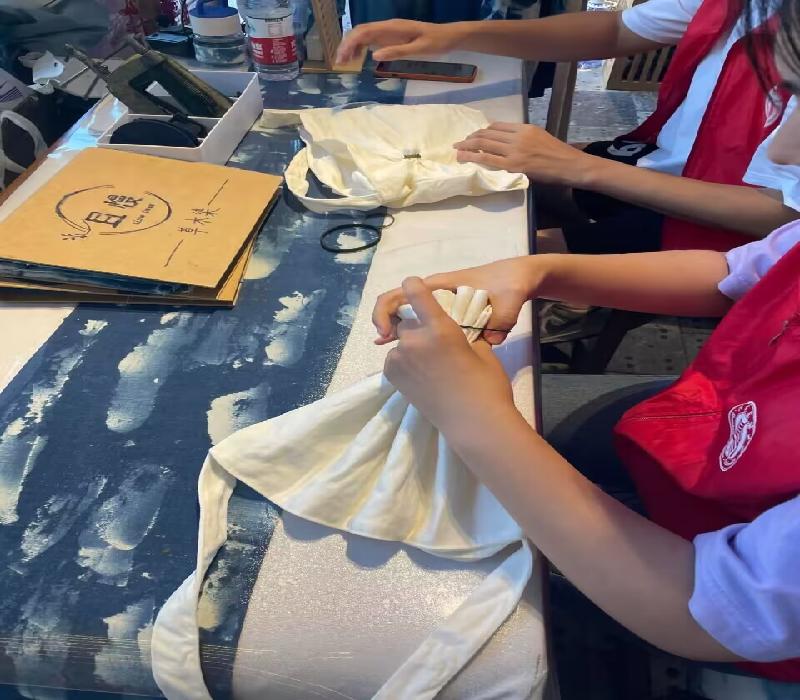 在活動現場,團隊成員親自參與到扎染的制作過程中。工匠們耐心地介紹了扎染的工藝和技巧,并提供了一系列的素材和工具,隊員們嘗試在布料上畫畫,學習如何運用不同的顏料和工具,制作出獨一無二的扎染作品。活動現場還設置了展覽區,展示了各種各樣的扎染作品。從傳統的花鳥圖案到現代的抽象藝術,每件作品都展現了扎染技藝的精湛和創新。