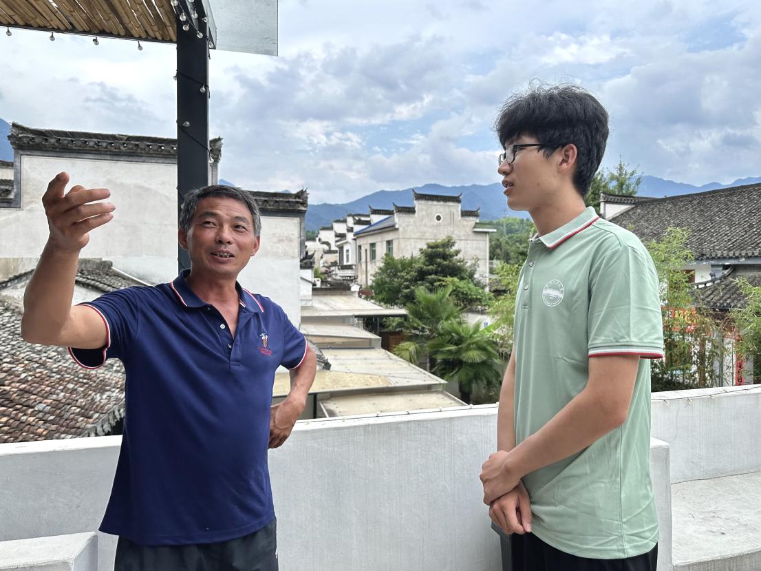 (圖為江村村總支黨委員強大雨書記和實踐團隊介紹江村民宿的發(fā)展現(xiàn)狀)