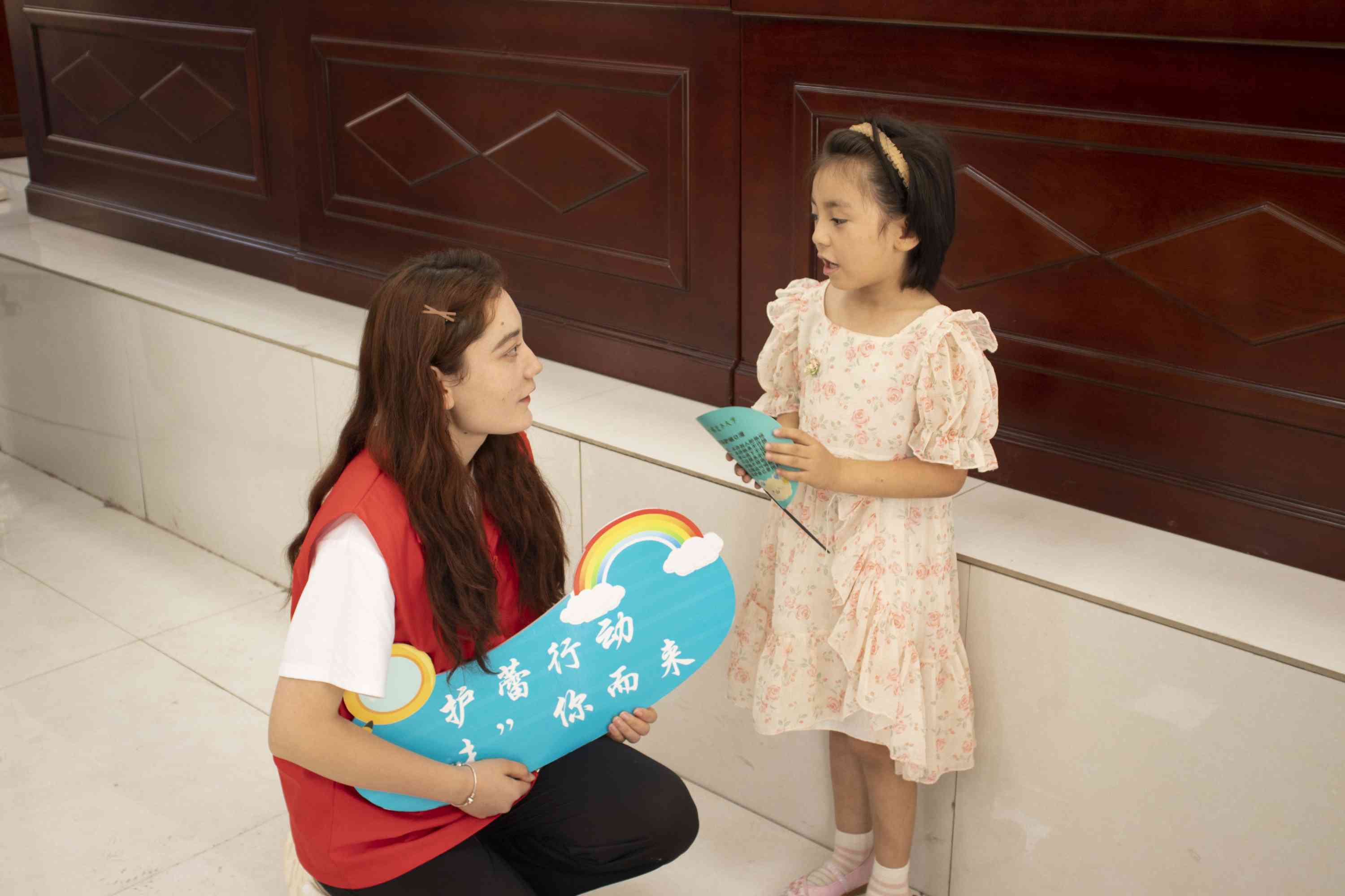 圖為實(shí)踐隊(duì)員馬芊芊和小朋友講解如何保護(hù)自己。