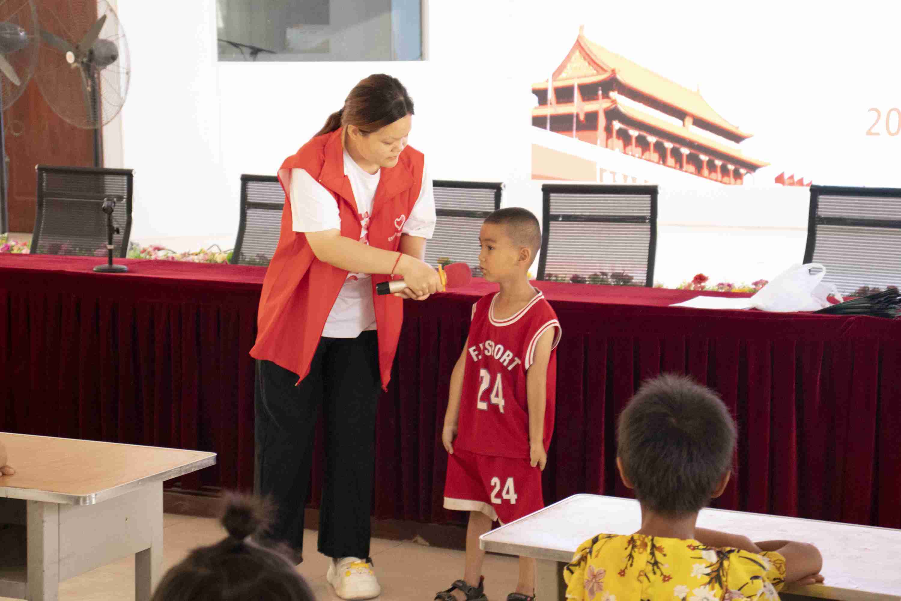 圖為實(shí)踐隊(duì)員穆耶賽爾·羅合曼給小朋友分發(fā)未成年保護(hù)文創(chuàng)扇子。