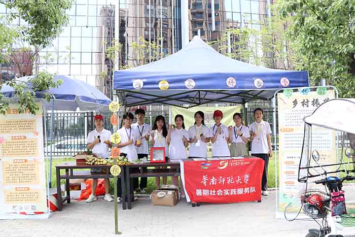 晶瑩的龍眼、香甜的芒果、飽滿的香蕉,在助農產品攤上擺放著各式各樣水果,每一位前來觀看科普宣講的居民都可以免費得到。攤位上的水果均是實踐隊成員向惠州當地果農收購,目的是讓居民品嘗到品質優良的水果,“食過返尋味”,向果農購買,以此達到助農扶農的目的。隊員們在現場拿著水果在攤位上向居民們展示,詳細地介紹了水果的產地和風味,同時為了宣傳本隊伍與學校,鼓勵居民積極參與,隊員們在準備美味的水果外還準備了豐富實用的隊伍文創,如印有隊伍logo“柚子”的扇子與口罩。在居民們在鄉村振興問答屋中回答問題后免費發放,給他們帶來知識的同時還有清涼與便利。前來攤位的小朋友們還在現場品嘗了龍眼,他們還積極地為助農產品攤做宣傳,“我回去喊我朋友也來參加!”