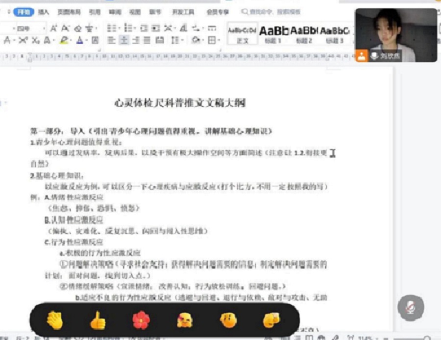 倡導(dǎo)和諧心態(tài),崇尚健康心理;心靈體檢尺,啟航入社區(qū)。本次會議由劉欣然同學(xué)主持,主要內(nèi)容為本次社會實踐的時間安排和人員分工等問題。經(jīng)過前段時間隊伍成員們與山東省臨沂沂南縣關(guān)工委孤困兒童心理輔導(dǎo)志愿服務(wù)團以及家鄉(xiāng)各大中小學(xué)的對接溝通,出于距離及規(guī)模的考量,現(xiàn)已確定本次社會實踐采用線上線下相結(jié)合的方式開展。會議伊始,主持人明確了每個人的任務(wù),確保實踐活動銜接流暢,開展有序。而在實踐的具體內(nèi)容方面,團隊依托擁有醫(yī)學(xué)心理學(xué)的專業(yè)優(yōu)勢以及擁有公共衛(wèi)生學(xué)院的調(diào)研特長,在開展科普宣講的同時決定組織開展具有調(diào)研意義的統(tǒng)計性活動,為說明當(dāng)代青少年心理問題現(xiàn)狀提供一定數(shù)據(jù)基礎(chǔ)。除此之外,團隊還將通過前期調(diào)研篩選出針對性宣講主題,通過調(diào)研優(yōu)化了線下點對點的科普內(nèi)容,提高了線下宣講點的宣講效率。最后會議強調(diào)了核心推文內(nèi)容宣發(fā)、聯(lián)絡(luò)注意事項、宣傳投稿等具體事宜,團隊在滿滿的熱情和十足的信心中圓滿結(jié)束了本次會議。
