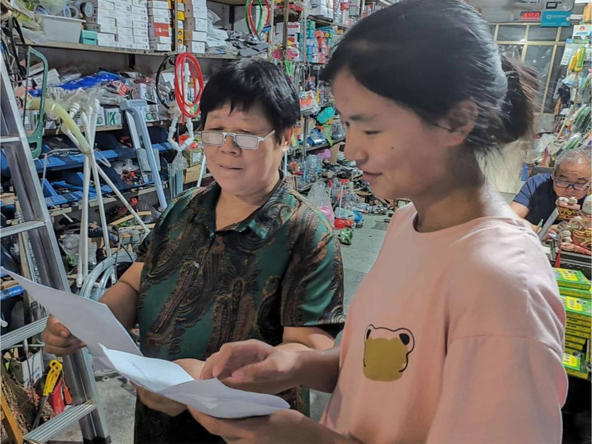 圖為街道上五金店店主接受實踐隊員采訪。