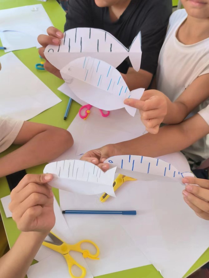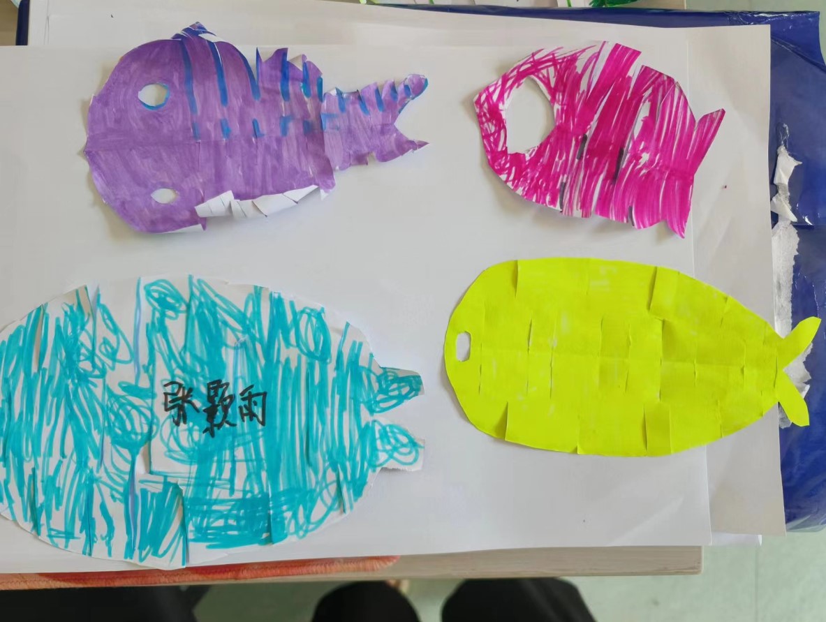 小魚,再沿輪廓剪下。孩子們積極地跟著老師的步驟進(jìn)行,做出了許多富有奇思妙想的手工作品。