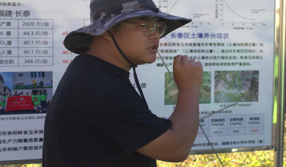 常駐長(zhǎng)泰區(qū)鮮食玉米示范試驗(yàn)基地的研究生王嘯向?qū)嵺`隊(duì)介紹了西湖村鮮食玉米產(chǎn)業(yè)現(xiàn)狀、鮮食玉米化肥減量增效技術(shù)、鮮食玉米病蟲害防治技術(shù)。據(jù)悉,西湖村絕大部分農(nóng)戶種植鮮食玉米存在過(guò)度施肥的問(wèn)題,過(guò)量施肥并沒(méi)有增加鮮食玉米的產(chǎn)量,反而會(huì)造成土壤酸化、產(chǎn)品品質(zhì)下降、種植成本高等一系列問(wèn)題。據(jù)長(zhǎng)泰區(qū)鮮食玉米示范試驗(yàn)基地研究得,優(yōu)化施肥后化肥減量50%以上,甜玉米的鮮穗產(chǎn)量和果穗性狀并未降低,反而取得了節(jié)本增收、提質(zhì)增效的成果,同時(shí)研究生團(tuán)隊(duì)也為緩解土壤酸化提出其他方案:施用石灰、土壤調(diào)理劑、秸稈還田、水旱輪作等。正所謂“窮理以致其知,反躬以踐其實(shí)”,在理論的基礎(chǔ)上學(xué)以致用解決農(nóng)業(yè)問(wèn)題,才能使農(nóng)業(yè)發(fā)展,促進(jìn)鄉(xiāng)村振興。