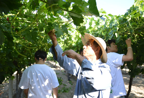 隨后,同學們來到葡萄園,了解到6連種植的葡萄品種很多,其中白雞心和紅提種植面積最大,產量最高,為連隊帶來了很高的經濟效益。最近紅提正處于膨大期,同學們細心觀察葡萄植株的果實生長、水肥、病蟲害情況和樹型,并結合日照時間和光照強度對園內葡萄的果品質量進行預估分析,將知識與實操“嫁接”。期間,恰好遇到了噴灑農藥的職工,結合葡萄地里的實際情況職工大叔給同學們講解了噴藥機高壓扇形噴藥嘴的工作原理。
