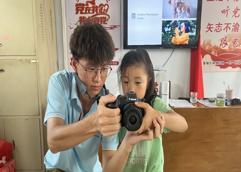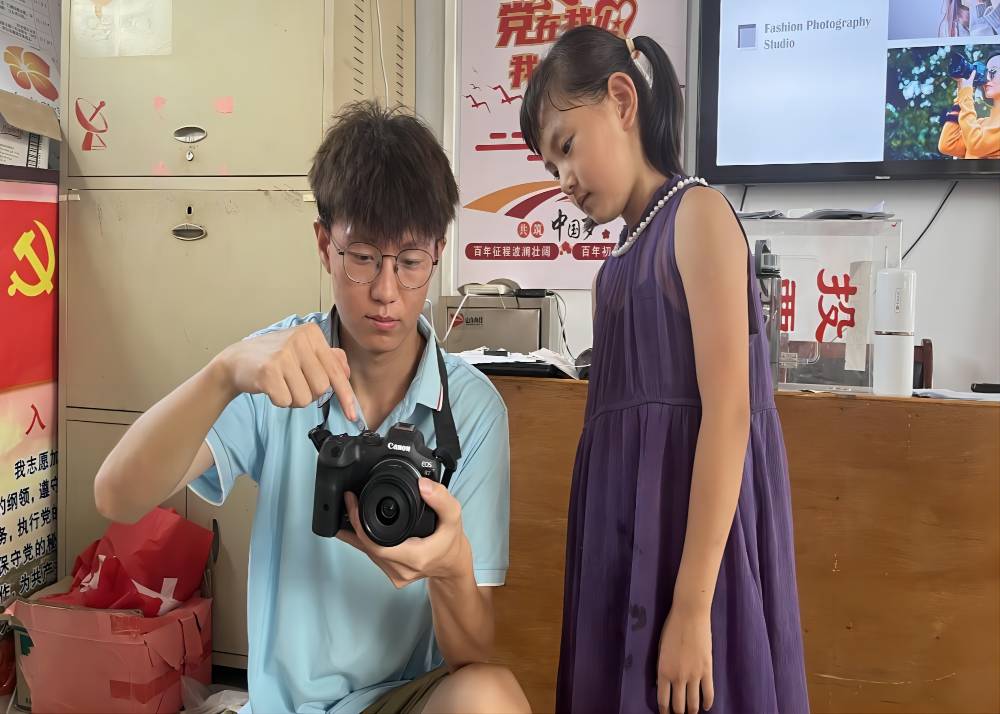 活動伊始,實踐小組成員王志勛“怎么拍、怎么拍得美、什么才是拍得美”等角度為孩子們進行了通俗易懂的講解。王志勛圍繞人像、光影、風景等不同拍攝主題,從如何選取拍攝角度、調光、配色、構圖等方面,通過讓孩子們觀賞自己所攝作品及現場實操教學的形式,由淺入深地為孩子們講解了相應的攝影知識,詳細解讀如何拍才能達到更好的效果,讓拍攝作品更加出彩。