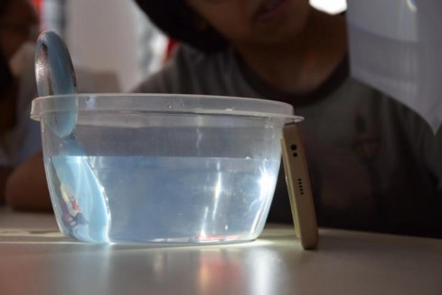 第一個實驗便是“消失的硬幣”:在杯子底部放一枚硬幣,然后往杯子中加水,在一旁觀察,,在加水的過程中,原本能被看到的硬幣突然看不到了!這其實是光的折射。與會折的筷子是同一個原理。