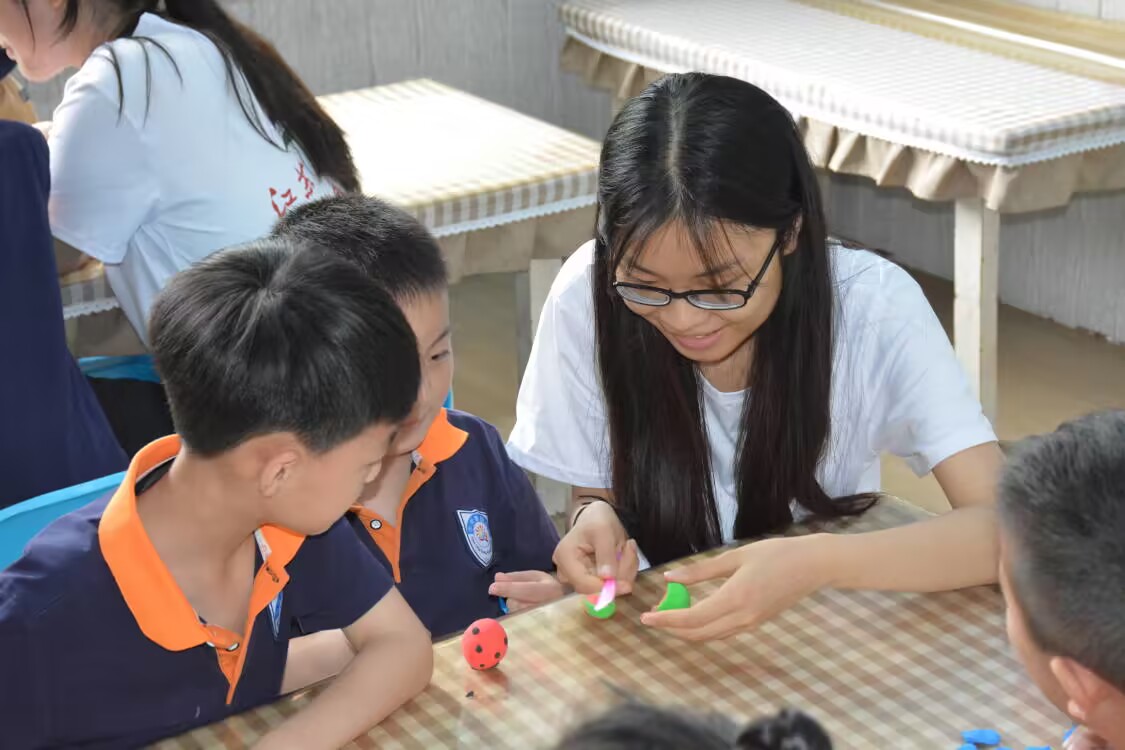 圖為服務(wù)隊成員與小朋友們合作進行手工創(chuàng)作