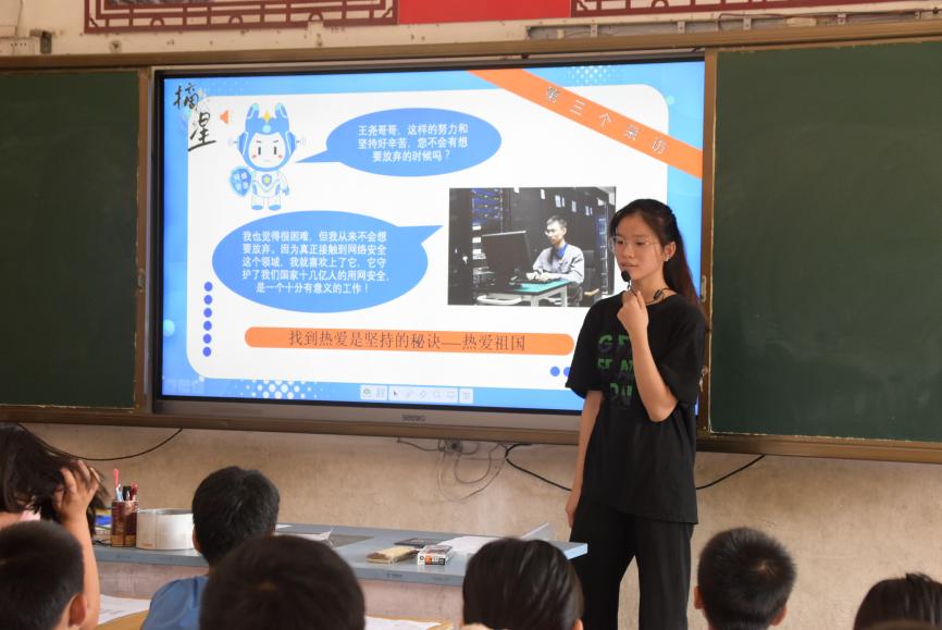 上午第一節課為文教板塊“網絡安全”系列課程的延續,由李心然老師和曾佳晶老師主講。兩位老師通過借用網絡發電站的意象和運用沈昌祥、王堯、黃鎮國三個人物事例,從網絡“防護墻”的奠基、構建到守護三個階段為學生捋清《網絡衛士》的課程邏輯,使“網絡安全為人民,網絡安全靠人民”的理念深入貫徹到學生心中,促使學生始終以守護網絡安全為己任,勤奮刻苦、精益求精、無私奉獻,為守護國家網絡安全貢獻自己的一份力量。
